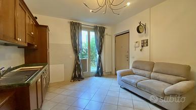 In posizione interna nel verde, adiacente parcheggio e parco pubblico, recentissimo monolocale su due livelli di 70 mq complessivi, con giardino privato e ampio box singolo.