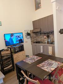 Salone con camino e angolo cottura, bagno, camera e balcone al piano primo.