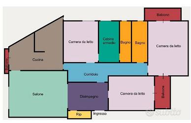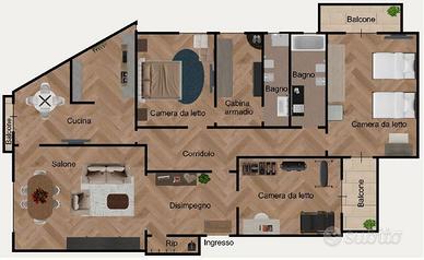 L'ingresso conduce a un immenso salone doppio, ideale per creare una zona living elegante e accogliente. A sinistra troviamo la cucina abitabile, luminosa e funzionale. La zona notte offre una camera padronale con cabina armadio finestrata e bagno in stile americano, una seconda camera con doppio punto luce grazie ai due balconi con esposizioni differenti e una terza stanza versatile, perfetta come studio, hobby room o ulteriore camera da letto.