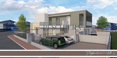 Rif: P 27.55 P1 Classe energetica: A4 Nel cuore della tranquilla frazione di Sandrà, a Castelnuovo del Garda, allinterno di una nuova e curata zona residenziale, proponiamo un elegante trilocale al piano primo con terrazzi abitabili, ideale per chi desidera vivere in un contesto moderno e riservato, immerso nel verde ma comodo ai principali servizi. Labitazione sarà parte di un esclusivo complesso di sole tre unità abitative, progettato per garantire privacy, comfort e qualità costruttiva. Il trilocale si sviluppa interamente su un unico livello, con ingresso indipendente dal piano terra che conduce al terrazzo di circa 26 mq, perfetto per godere di momenti di relax allaperto o per organizzare cene conviviali nelle stagioni più miti. Linterno si apre su una luminosa zona giorno con soggiorno e angolo cottura, ben distribuiti e pensati per offrire funzionalità e accoglienza. Un comodo ripostiglio e un bagno completano questa prima parte della casa, mentre un disimpegno conduce alla zona notte, composta da due camere matrimoniali e da un secondo bagno finestrato. La proprietà include un garage singolo al piano terra, direttamente collegato allabitazione per garantire praticità e sicurezza, oltre a un posto auto scoperto riservato. Dal punto di vista impiantistico, limmobile sarà dotato di riscaldamento autonomo a pavimento alimentato da pompa di calore, con impianto fotovoltaico dedicato per la produzione di energia elettrica, a conferma dellattenzione verso lefficienza energetica e la sostenibilità ambientale. Le finestre e le porte-finestre saranno realizzate in PVC rigido, con predisposizione per linstallazione di zanzariere ove possibile, mentre il portoncino dingresso sarà blindato, a garanzia di sicurezza e protezione. Questa soluzione rappresenta unopportunità ideale per chi cerca una casa nuova, funzionale e ben rifinita, in una zona residenziale in espansione, perfetta sia come abitazione principale che come...