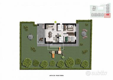 Appartamento n°6: appartamento trilocale composto da ampio soggiorno, due camere e doppi servizi, oltre a porticato di 21 mq. L'appartamento è dotato di ampio giardino dangolo, per unarea verde totale di 325mq. Box singolo, doppio o triplo acquistabile separatamente.