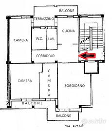L'appartamento si trova al 4° piano ascensorato, ed ha una superficie interna di circa 100 mq, composta da 4 locali, cucina, bagno e lavanderia.