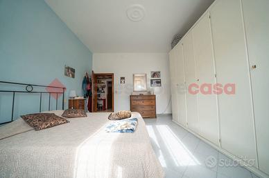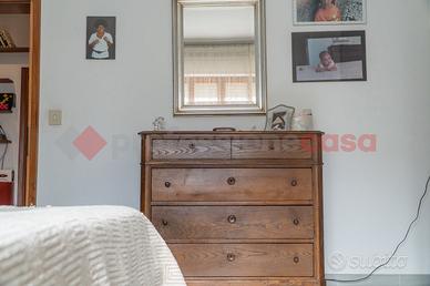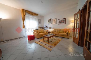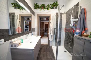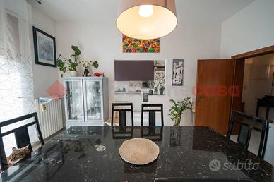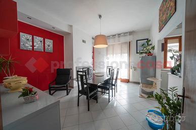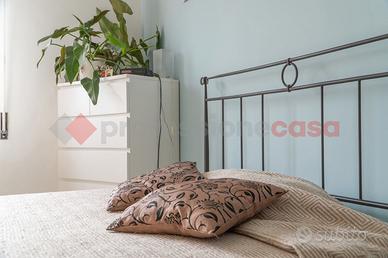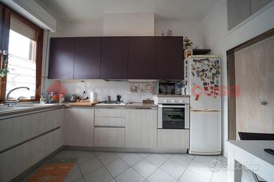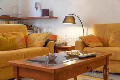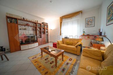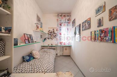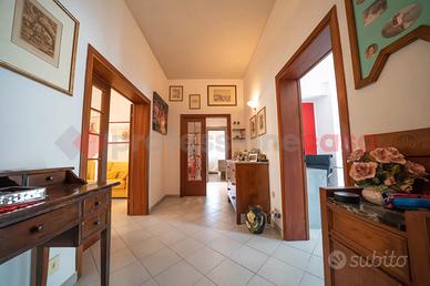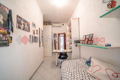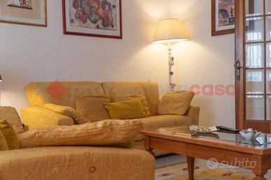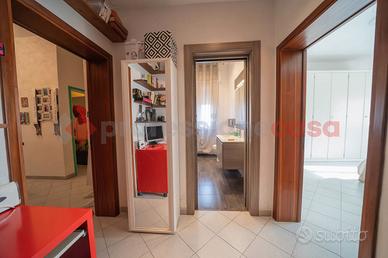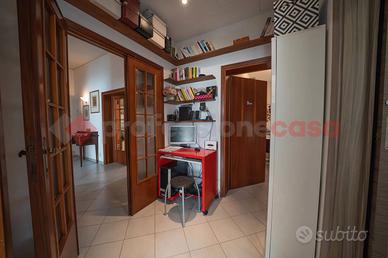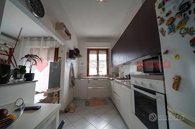 L'immobile si compone entrando di un ampio ingresso, cucina con tinello dotata di elegante camino e di una portafinestra dalla quale accedere al primo balcone dell'abitazione; proseguendo troviamo la sala - anche questa con accesso ad un ulteriore balcone - , una camera matrimoniale, un bagno finestrato con doccia recentemente riammodernato e due stanze studio attualmente adibite a cameretta e cabina armadi.
