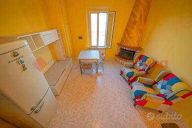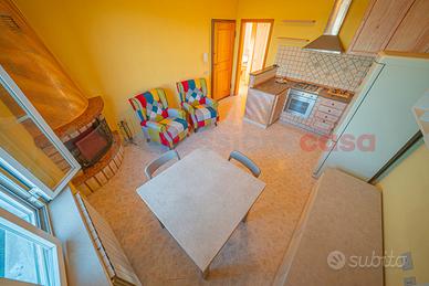L'ingresso si apre su una luminosa zona giorno con cucina a vista e camino, un ambiente accogliente e funzionale. Dal soggiorno si accede al disimpegno notte che conduce alle due camere - una matrimoniale e una cameretta - e al bagno finestrato.