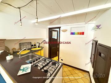 Gli spazi sono stati ottimizzati con grande intelligenza: al primo livello si sviluppa un unico ambiente open space con soggiorno, angolo cottura e bagno con doccia; attraverso una scala interna si accede al soppalco, dove è stata ricavata una camera da letto con armadio a muro, in un'atmosfera intima e riservata.