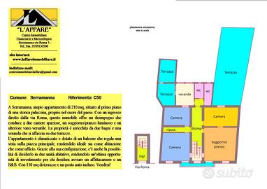 A Serramanna, ampio appartamento di 210 mq, situato al primo piano di una storica palazzina, proprio nel cuore del paese. Con un ingresso diretto dalla via Roma, questo immobile offre un disimpegno che conduce a due camere spaziose, un soggiorno/pranzo luminoso e un ulteriore vano versatile. La proprietà dispone di due bagni e una veranda che si affaccia su due terrazze.