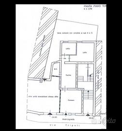 65 mq - ingresso su ampio salotto, una cucina abitabile, un servizio finestrato, una camera da letto matrimoniale e una cameretta entrambe con affaccio su corte.