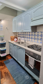 Cucina completa di accessori, frigorifero, forno elettrico, forno a microonde, bollitore e stoviglie varie.