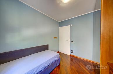 L'appartamento si sviluppa su due livelli, al piano terreno, perfettamente quadrato, vi è un soggiorno/pranzo con grandi finestrature scorrevoli sul porticato, una cucina, due camere e due bagni, al piano interrato una grande tavernetta con palchetto e camino, resa luminosa da grandi finestre su una ampia intercapedine che circonda tutto l'interrato, nonché tre locali di sgombero molto ben rifiniti e riscaldati ed un bagno. Completa la proprietà un'autorimessa di quasi 50 mq, direttamente collegata con l'appartamento, nonché un posto auto esclusivo esterno.