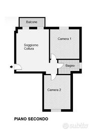 E' composto da ampio soggiorno con cucina a vista, due camere da letto, bagno e balcone oltre a cantina al piano seminterrato.
