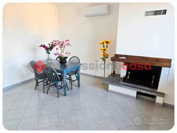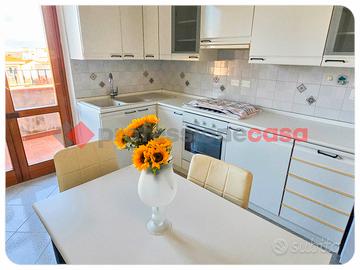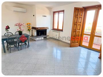 La proprietà e' cosi' composta: abbiamo la Cucina Abitabile con Ripostiglio ad uso dispensa ed il Salone con camino, dai quali si accede al Terrazzo. Il reparto notte e' composto da due Camere di cui una Matrimoniale, una Media da cui si accede ad un secondo Terrazzo Abitabile ed il Bagno finestrato con doccia in muratura. Dal disimpegno notte inoltre si accede, tramite botola, a un comodo secondo Ripostiglio ideale come spazio di deposito aggiuntivo. Completa la proprieta' un Garage di circa mq.18 dotato di acqua corrente e accessibile tramite cancello automatico con radiocomando, situato al piano terra con diretto accesso alle scale condominiali. Il Riscaldamento e' Autonomo (caldaia Lamborghini) con radiatori in alluminio piu' impianto di climatizzazione (caldo-freddo) e le spese condominiali mensili ammontano a circa € 40 e sono comprensive di luce, pulizia scale, amministratore, manutenzione cancello elettrico e addolcitore. Gli infissi esterni sono in legno con persiane e zanzariere ed i pavimenti sono in ceramica. L'impianto di allarme, già disponibile, può essere facilmente installato, contribuendo alla sicurezza. A.P.E.: Classe G, Ipe 175 Kwh/m2anno. - Rif. 1287 -
