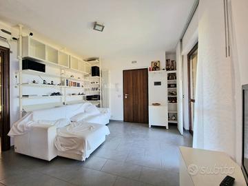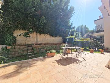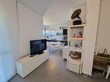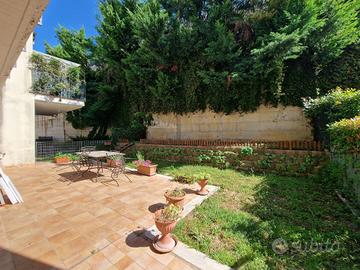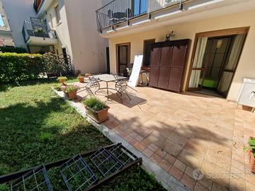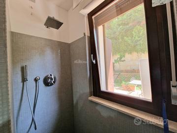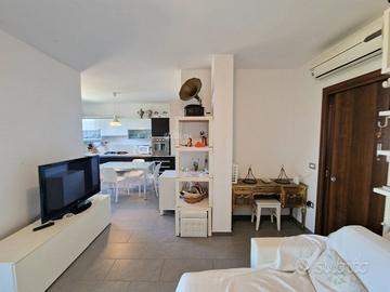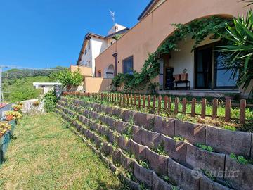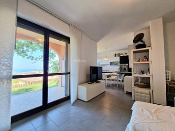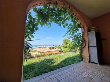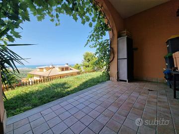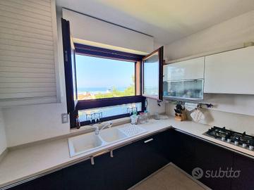 Appartamento 80 mq al piano terra. Soggiorno con cucina abitabile a vista (volendo separabile), due camere da letto di cui una spaziosa matrimoniale ed una camera doppia, due bagni di cui uno di servizio nella zona giorno ed uno con doccia nella zona notte. Completa la prorprietà un portico con splendido affaccio sul mare con giardino di mq 50 e una corte pavimentata di mq 60 e giardino di mq 50 sul lato ovest. Garage di mq 40 al piano seminterrato.