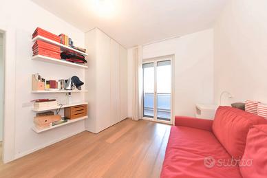 Qui sorge l'attico di 47 mq costituito da un soggiorno con angolo cottura a vista, un disimpegno con guardaroba a scomparsa, una camera da letto con cabina armadio e un bagno.