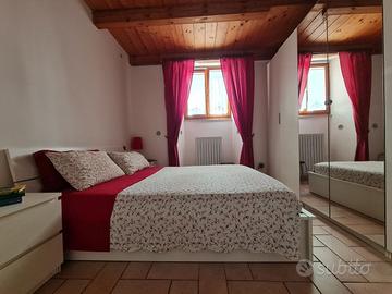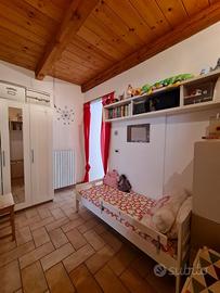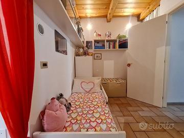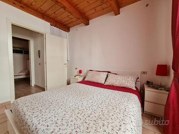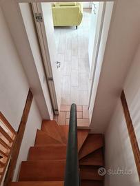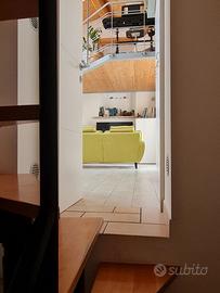 L'abitazione ha una superficie complessiva di 80 mq così distribuiti: al primo piano troviamo un ampio e luminoso soggiorno con angolo cucina, un bagno e una scala che conduce al piano terra, dove sono presenti una camera matrimoniale, uno studio e un secondo bagno. Le travi a vista a soffitto donano grande carattere dell'appartamento, connotato anche dalla presenza di ottimi dettagli interni come gli infissi in legno con doppi vetri.