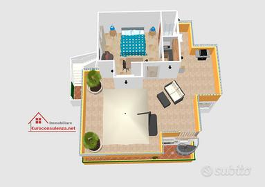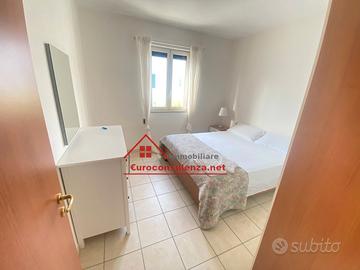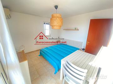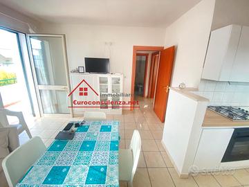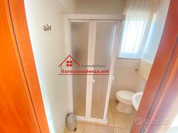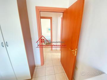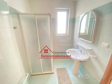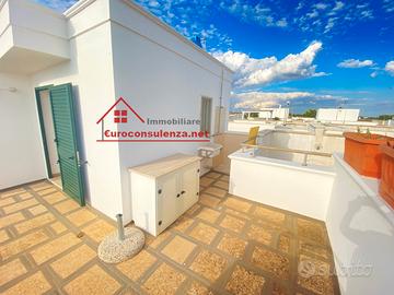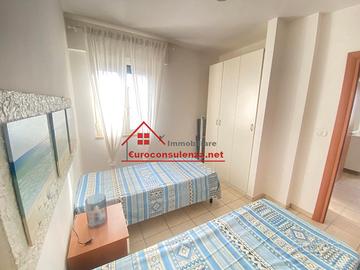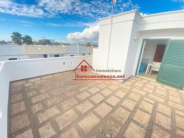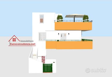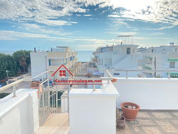 L'accesso avviene tramite un cancello che conduce ad uno spazio esterno di pertinenza esclusivo, dotato di doccia esterna e un sotto scala con lavatrice. Salendo le scale si arriva all'ingresso dell'appartamento preceduto da un ampio balcone angolare che circonda due lati della casa. All'interno troviamo una luminosissima sala da pranzo con angolo cottura, disimpegno, 2 camere da letto e un pratico bagno. Dal balcone laterale si accede tramite una scala a chiocciola sul lastricato solare di proprietà esclusiva, dove è presente un vano adibito a monolocale completo di letto, angolo cottura, bagno e ripostiglio. Lo spazio esterno una volta arredato con mobili da giardino è ideale per pranzare o cenare fuori in completo relax avendo una suggestiva vista mare. Completa la proprietà un box auto privato al piano interrato , accessibile tramite rampa condominiale.