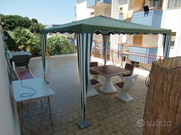 Vendesi appartamento in condominio al piano rialzato completamente arredato (come da immagini). N. 2 camere da letto con finestra, N.1 bagno finestrato con doccia e posto lavatrice, ingresso, ampio soggiorno, cucina e ripostiglio, N.1 balcone con accesso esclusivo a veranda di circa mq. 60. Garage di circa mq. 15.