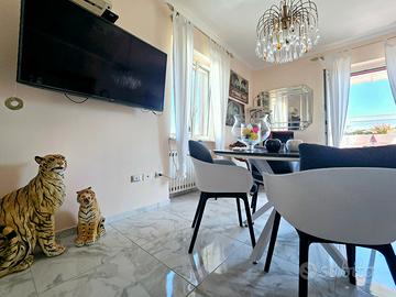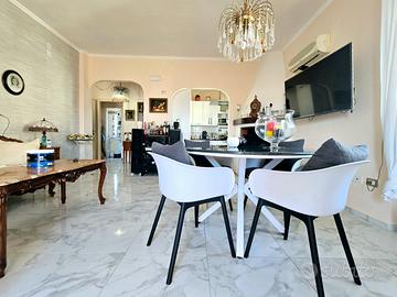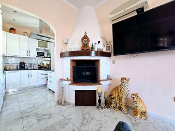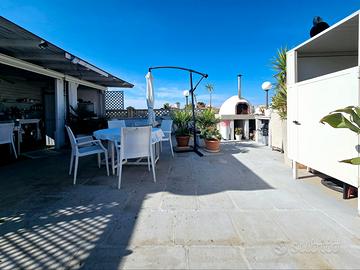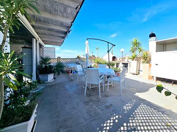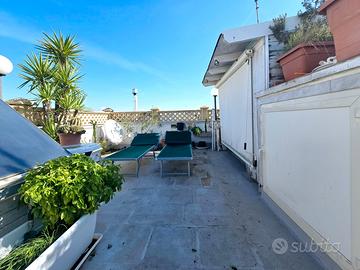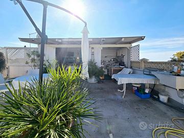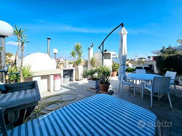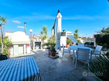 L'immobile: Entrando ad accoglierci un ingresso in disimpegno, che ci conduce a tutte le aeree dell'appartamento. La zona giorno è composta ampio soggiorno, molto luminoso grazie alla doppia esposizione angolare, e cucinotto separato. Dallo stesso soggiorno, si accede in un comodo balcone, dove è presente una scala esterna, che porta direttamente all' ampia area solare di proprietà, che viste le ampie metrature, è perfettamente abitabile: composta da caminetto, tavolo da pranzo e comoda cucina esterna. Un ottimo spazio per passare del tempo all'area aperta, organizzare cene e pranzi in compagnia e godersi il clima mediterraneo in tutta tranquillità e molta privacy.