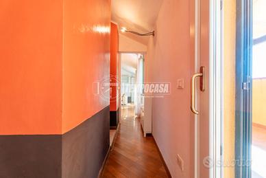 Ingresso su un ampio e aperto soggiorno con angolo cottura, pavimentato il parquet, con due vetrate scorrevoli che danno accesso al terrazzo di oltre 20 mq, che gode di un ottima privacy, essendo l'ultimo piano dello stabile;