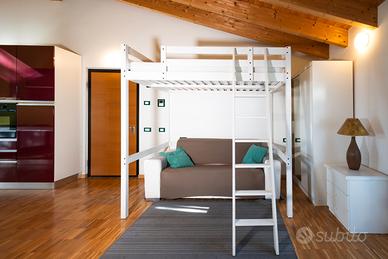 L'open space posto al piano primo è stato rifinito con materiali di elevata qualità e dotato di ogni confort: come il prezioso tetto in legno con travi a vista, che oltre ad avere un impatto scenico, serve a mantenere il calore e regolare l'umidità; o ancora il moderno impianto di ventilazione meccanica controllata che consente i ricambi d'aria con il recupero di calore all'80% nella stagione invernale, pompe di calore geotermiche per l'acqua calda e riscaldamento a pavimento, impianto solare termico e fotovoltaico. Tutti i pavimenti sono in parquet, eccetto quello del bagno piastrellato.