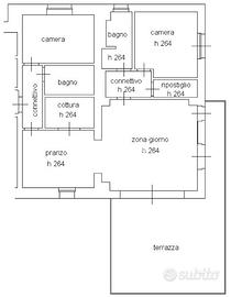 La zona notte offre due camere da letto ben dimensionate e due bagni (uno finestrato). In base alle tue esigenze è possibile ricavare una terza camera. Completa la soluzione un pratico ripostiglio.