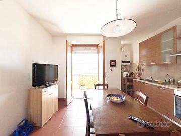 Appartamento luminoso, posto a piano terzo di condominio a sei, di mq 105, composto da: ingresso, soggiorno con camino, pranzo con angolo cottura, due camere matrimoniali, cameretta/studio, due bagni, balconi, oltre a fondo, garage a piano terra e giardino ad uso condominiale con posti auto esterni.