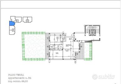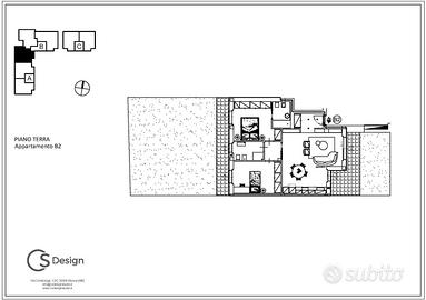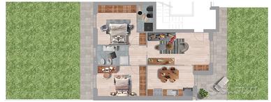 - Appartamento B5: posto al piano terra con giardino fronte-retro, composto da ingresso nella zona living con cucina a vista serviti da porticato esposto a est affacciato sul giardino, zona notte, servita da giardino esposto a ovest, composta da camera padronale con bagno, seconda camera e bagno disimpegnato.