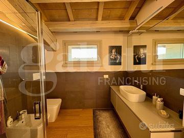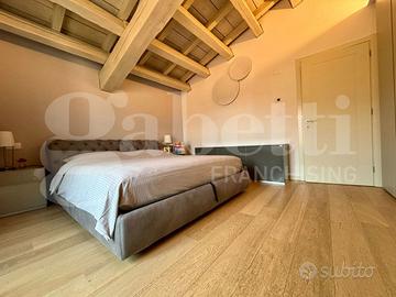 Un corridoio conduce al primo bagno finestrato, dotato di doccia e comoda zona lavanderia. Dal soggiorno si accede inoltre a uno studio, a un secondo bagno finestrato con doccia e, salendo pochi gradini, alla raffinata zona notte: una camera matrimoniale ampia, una camera singola spaziosa e un terzo bagno, anch'esso finestrato e con doccia.