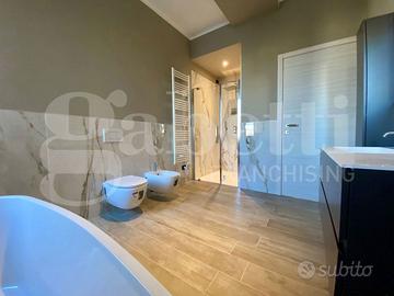 L'ingresso è direttamente nella zona giorno con cucina a vista e affaccio sul cortile interno; proseguendo troviamo due diverse zone di disimpegno che conducono ai due bagni, uno dei quali finestrato, e alle due camere da letto, una spaziosa matrimoniale ed una ad uso singolo ma di comode dimensioni.