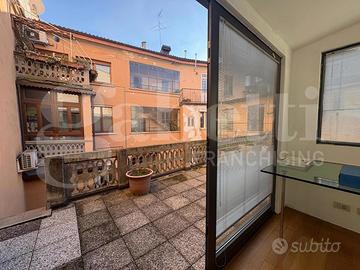 All'interno di una graziosa palazzina del Centro Storico proponiamo un interessante pied a terre, completamente ristrutturato nel 2005. Attraversando un cortile interno condominiale, si arriva all'entrata dell'appartamento, distribuito su tre diversi livelli; all'ingresso troviamo il comodo bagno, provvisto di doccia, ed una scalinata che conduce al piano abitativo, composto da una spaziosa zona living con parete cottura, una camera da letto matrimoniale dotata anche di cabina armadio, e l'accesso ad una balconata, con affaccio interno. Proseguendo e salendo al secondo ed ultimo piano, troviamo uno spazio accessorio, ideale come studio, che gode di accesso ad una bellissima terrazza privata, con gradevole affaccio sui tetti del Centro. Internamento la soluzione presenta finiture di pregio, con pavimentazione in parquet in tutti gli ambienti, infissi in legno con doppio vetro, riscaldamento a pavimento e split dell'aria condizionata nel soggiorno, nella camera da letto e nello studio.