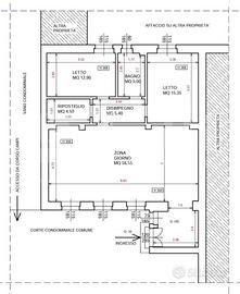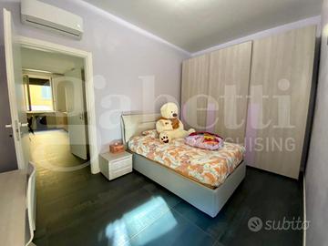 Superata la zona di ingresso troviamo uno spazioso living con cucina a vista con isola e piano cottura ad induzione; un piccolo disimpegno conduce nel reparto notte, costituito da due camere entrambe di buone dimensioni servite da un bagno finestrato con doccia e sanitari sospesi.