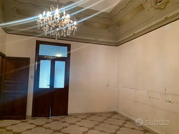 Si accede dal piano strada attraverso una rampa di scale con doppio ingresso all'immobile. Il primo piano è composto da un ampio ingresso, un grande salone con apertura sul corso principale, camera da letto, (questi 3 ambienti sono caratterizzati da affreschi al tetto) cucina abitabile, bagno e un balcone verandato che si affaccia sul retro della casa.