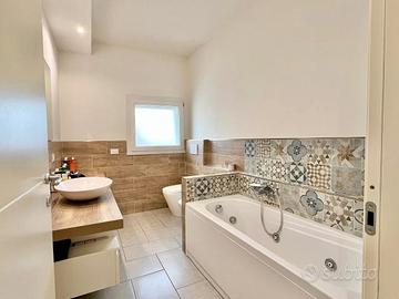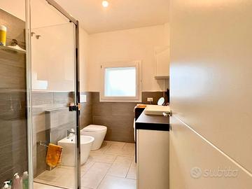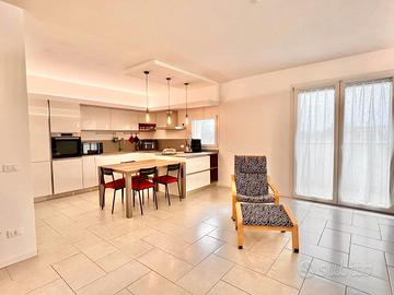 L'ingresso si apre su un ampio soggiorno luminoso, dove la cucina a vista firmata Veneta Cucine è perfettamente integrata con la zona giorno, creando un ambiente accogliente e funzionale. Qui ogni dettaglio è pensato per chi ama vivere la casa in modo pratico e moderno.