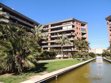 Fiumicino Parco Leonardo, complesso Le Pleiadi, in palazzina con ascensore, appartamento al 3° piano con affaccio interno verso il giardino condominiale e le fontane, buono stato, composto da ingresso, soggiorno, cucinotto, camera matr., studio (utilizzabile come cameretta), disimpegno, 2 bagni ( entrambi esterni, 1 con finestra, 1 cieco), 2 balconi e box auto mq 15.