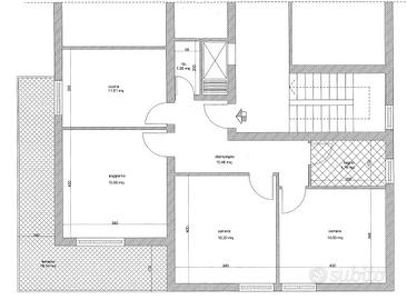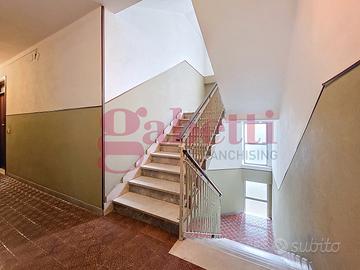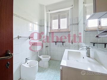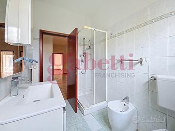 L'ingresso con ripostiglio conduce alla cucina abitabile, dotata di accesso alla terrazza che circonda l'appartamento e ospita un vano tecnico con caldaia autonoma.