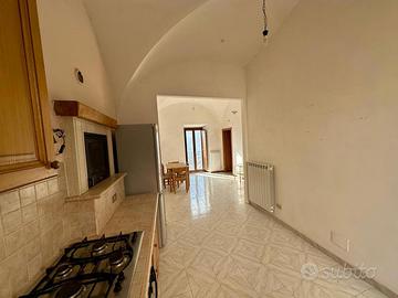 Una scala a chiocciola ci conduce al piano inferiore dove troviamo un disimpegno e una camera matrimoniale rifinita con soffitto con volte a croce.
