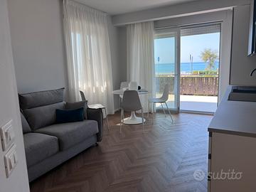 Appartamento di 60m2 sul lungomare di Scauri, con terrazzo di 20m2 con affaccio sul mare. Completamente ristrutturato di recente, presenta rivestimenti di pregio ed è arredato con gusto e cura dei dettagli, L'appartamento e' composto da soggiorno con cucina a vista, terrazzo panoramico con vista sul Golfo, 1 camera, 1 cameretta, 1 bagno.