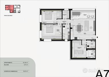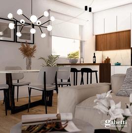 Questo spazio abitativo, progettato con cura, presenta: un ambiente living con cucina a vista e terrazzo, due camere da letto, un bagno e una suite con bagno e balcone privato. Grazie alla certificazione energetica A2 e alla predisposizione per l'installazione di impianto fotovoltaico, si ha la possibilità di raggiungere la classe A4.