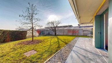 - Al piano terra troviamo un bilocale con soggiorno e cucina a vista con uscita diretta sul giardino privato, bagno, camera da letto matrimoniale, oltre a una taverna con ripostiglio e lavanderia. Questo appartamento è in classe energetica B, grazie all'innovativo cappotto bio in canapa, infissi in PVC, riscaldamento a pavimento e aria condizionata in tutti gli ambienti, garantendo comfort e risparmio energetico.