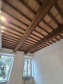 Nonostante l'assenza di pertinenze esterne come balconi o terrazzi, l'appartamento beneficia di un doppio affaccio che, insieme agli alti soffitti con travi a vista, regala una luminosità naturale straordinaria, creando atmosfera .