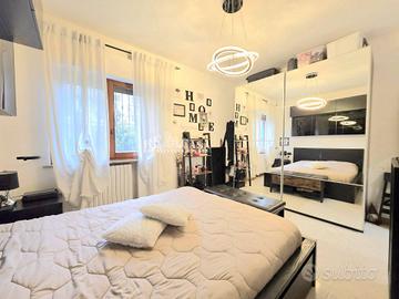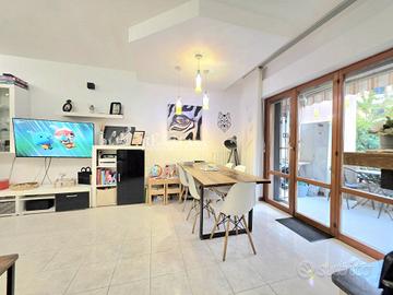 Appartamento 66 mq posto al piano terra rialzato con ingresso autonomo. Composto da ingresso su ampio soggiorno con camino, angolo cottura separato, due camere da letto di cui una spaziosa matrmoniale ed una singola, bagno con doccia, due balconi per complessivi mq 16 e con scala di accesso al giardino per complessivi mq 75. Completa la proprietà un garage di mq 26 al piano seminterrato.