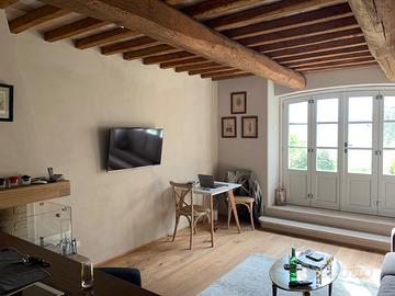 In provincia di Siena , nella campagna di San Casciano dei Bagni vendesi appartamento situato in un borgo con piscina e finemente ristrutturato, l'appartamento di circa 78 metri quadri composto da salone, cucina, due camere da letto e un bagno