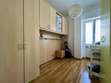 Proseguendo all'interno dell'abitazione troviamo due bagni, entrambi con doccia: uno più piccolo e cieco, l'altro più grande e finestrato. Gli interni sono completai da due bellissime camere da letto: una camera padronale servita da balcone e una cameretta, entrambe con parquet a pavimento.