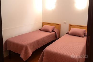 Appartamento di 65 mq ammobiliato, composto da ingresso-soggiorno, cucina, camera con letto matrimoniale e bagno padronale con doccia, camera con due letti singoli, secondo bagno con doccia, vano con lavatrice e lavabo per bucato biancheria, veranda coperta, cortile, posto auto scoperto in area parcheggio privata. Completo di stoviglie e accessori per cucina.