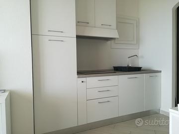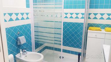 Condizionatori con inverter a pompa di calore inverno /estate in soggiorno e camera matrimoniale. Bagno completo di doccia rettangolare molto ampia e comodi mobili contenitori e sanitari sospesi.