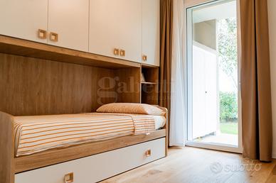 Proseguendo verso la zona notte si trovano un bagno finestrato con doccia e due camere, una matrimoniale e una singola entrambe servite da un giardino esclusivo, rifinito a prato, che dona luminosità agli ambienti e un raffinato spazio esterno.