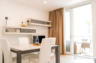 L'appartamento si apre su una luminosa zona giorno con salotto e cucina a vista, uno spazio elegante e funzionale valorizzato da una veranda che si estende verso l'esterno: la parte coperta è pavimentata con raffinate mattonelle creando un naturale prolungamento della casa mentre quella scoperta si caratterizza per la sabbia che richiama l'atmosfera della spiaggia.