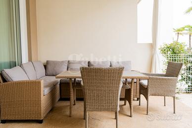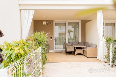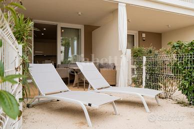 L'appartamento si apre su una luminosa zona giorno con salotto e cucina a vista, uno spazio elegante e funzionale valorizzato da una veranda che si estende verso l'esterno: la parte coperta è pavimentata con raffinate mattonelle creando un naturale prolungamento della casa mentre quella scoperta si caratterizza per la sabbia che richiama l'atmosfera della spiaggia.