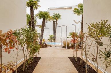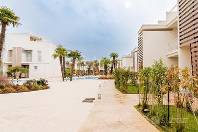 L'appartamento si apre su una luminosa zona giorno con salotto e cucina a vista, uno spazio elegante e funzionale valorizzato da una veranda che si estende verso l'esterno: la parte coperta è pavimentata con raffinate mattonelle creando un naturale prolungamento della casa mentre quella scoperta si caratterizza per la sabbia che richiama l'atmosfera della spiaggia.