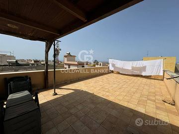 Il palazzetto è suddiviso in un totale di quattro mini appartamenti. I primi due, un monovano e un bivani del tutto indipendenti, sono al pianterreno e hanno accesso diretto su strada. Da un portoncino si accede a una scala comune che conduce ad altri due mini appartamenti (ancora un monovano e un bivani) posti al piano superiore. Da qui salendo ancora si arriva fino al piano copertura, dove una grande terrazza (oltre 80 mq) dotata di cucina a vista è parzialmente coperta da un'ampia tettoia in legno. La terrazza è già attrezzata con tavoli e panche, ideale per cenare all'aperto col favore della fresca brezza marina che a Lampedusa rende confortevoli anche le notti più calde. La proprietà, data la posizione centralissima e la sua suddivisione in quattro mini appartamenti, è ideale per essere messa facilmente a reddito nella lunga stagione calda lampedusana. Alcuni lavori necessari, come il ripristino degli intonaci in facciata e il rinnovo della tettoia al piano copertura, giustificano il prezzo relativamente contenuto.