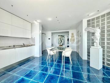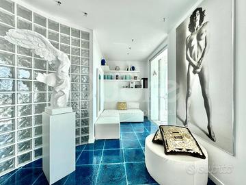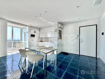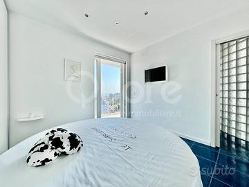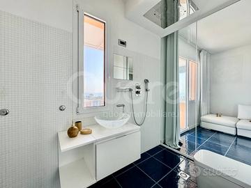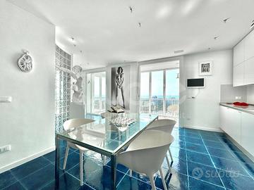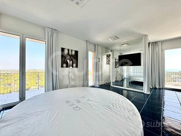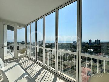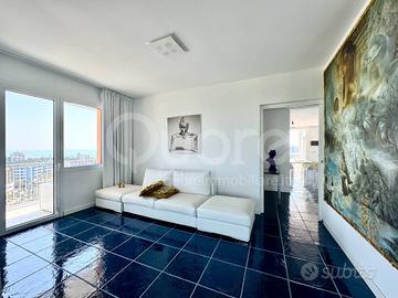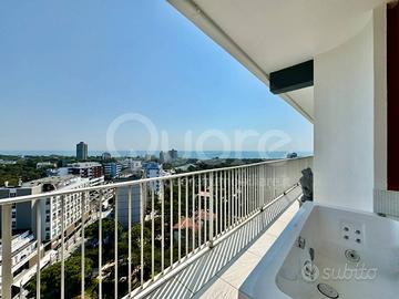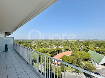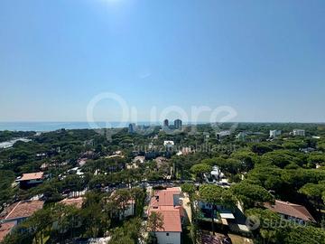 Esclusivo attico con strepitosa vista panoramica, situato in una palazzina signorile a Lignano Pineta, a pochi passi dalla spiaggia e vicino al centro pedonale. Limmobile, posto al 12° piano, è stato completamente ristrutturato e si compone di: ingresso, ampia zona living open space con cucina a vista, terrazzo perimetrale di 50 mq, parzialmente verandato, accessibile da tutte le stanze e con splendida vista mare. La zona notte include due camere matrimoniali, entrambe con bagno en suite. Da ogni ambiente si può ammirare un panorama mozzafiato sulla pineta e sul mare di Lignano. Lappartamento è dotato di impianto di climatizzazione, controsoffitti con illuminazione a LED, portoncino blindato, pavimenti in ceramica, infissi in alluminio con vetrocamera e finiture di pregio. Completano la proprietà due posti auto numerati allinterno dello scoperto condominiale.